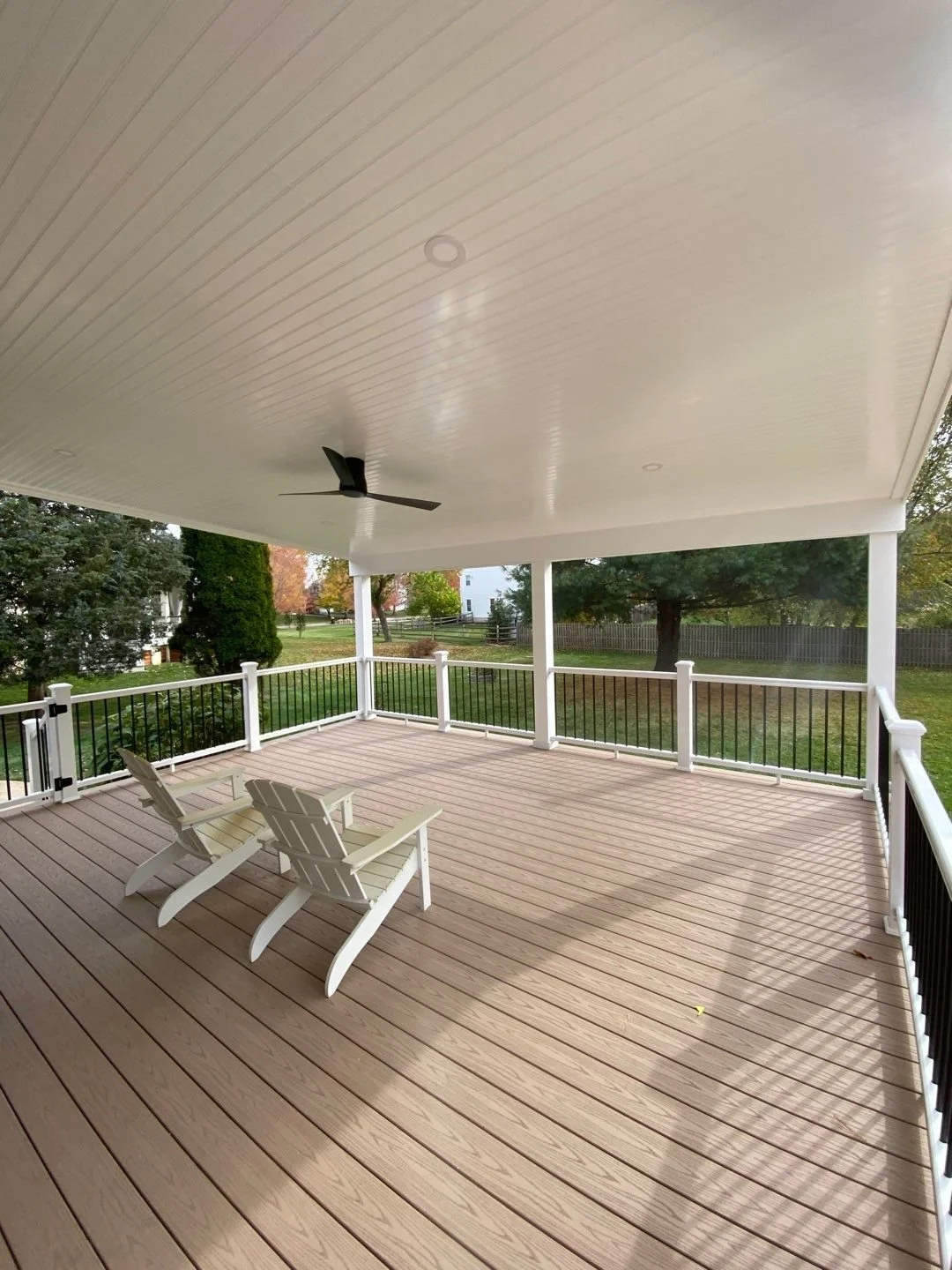When planning to build your outdoor living space it’s important to find the right contractor that’s capable of bringing your vision to life. Don’t worry Schrock Exteriors builds decks with unlimited options whether you're looking for a roof, pergola, portico, or gazebo covering your deck. We also offer custom dry spaces underneath your deck if you're looking to utilize that 8’ in height or more space underneath your deck on a rainy day. Custom fireplaces on roofed decks can also bring a new cozy space to your home. Lighting options such as in deck, railing, and led can lights are available. Ceiling fans installed on a screened in porch or and open roof over deck layout can offer fresh air flow throughout your new outdoor living space.